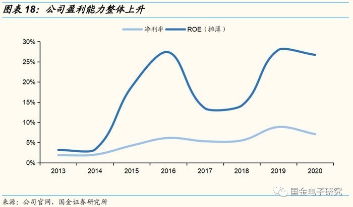 公司盈利能力稳中有升。1)公司净利润率稳中有升,2019年提升3.3pct至8.85%,主要系当年电源管理芯片和马达驱动芯片毛利率大幅上涨,且规模效应下费用率下降;2020年受毛利率下降影响,净利率有所回落。2)公司ROE波动上升,2020年为26.72%,盈利水平较高。