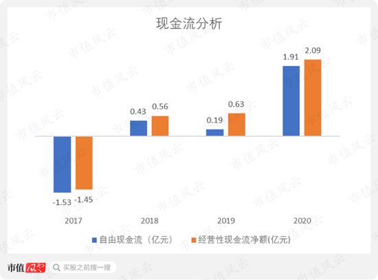 公司的经营性现金流净额从2018年开始转正,从2018年的0.56亿元增长至2020年的2.09亿元,自由现金流也从2018年开始净流入,并在2020年达到1.91亿元。