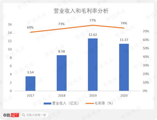 2017-2020年,公司营业收入从3.54亿元增长至11.37亿元,毛利率保持在70%左右。