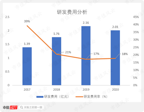 研发费用从2017年的1.39亿元增长至2020年的2.01亿元,研发费用率从2017年的39%下降至2020年的18%。