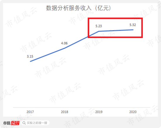 2017-2020年,数据分析服务收入从3.15亿元增长至2020年的5.32亿元,从下图的曲线看,2019-2020年,数据分析服务收入的斜率明显降低,说明增速明显放缓了。