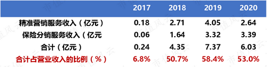 2017-2020年,精准营销服务和保险分销服务两者合计收入,从0.24亿元上涨至6.03亿元,两者合计占营业收入的比例从6.8%上升至53%。