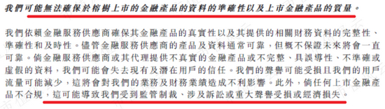 百融云说,公司内部会有一套监控程序,会自行对金融机构进行尽职调查,并建立相应的白名单;但公司又说了,无法保证平台上金融产品的质量,一旦产品不合规,监管制裁、经济诉讼等,肯定是跑不了的,公司经营也会受到冲击。