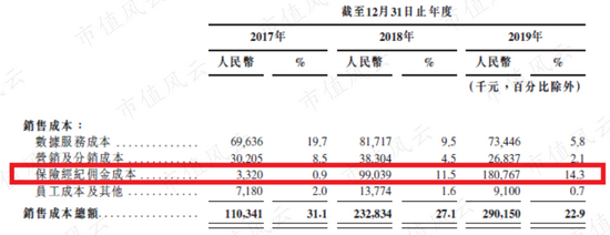 另外,随着互联网金融中介业务逐渐成为公司最核心的业务,支付给保险经纪人的佣金,也随之成为营业成本中的大头,2017年,保险经纪人佣金成本占营业成本的比例只有3%,2019年,这一比例就达到62%。