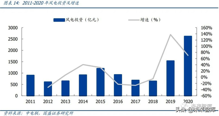 新能源发电投资快速增长,风电爆发成为最大电源投资类别。十三五期间,以风电和太 阳能发电为代表的新能源电源投资快速增长,特别是风电投资在 2019-2020年出现爆发。2019-2020 年风电投资分别为 1535/2618 亿元,同比分别增长 138%/71%。风电投资已 成为每年电源投资中最大类别,2020 年占据电源投资量的 50%。新能源发电投资占比 较 2015 年提升近 20 个 pct。风电等新能源投资的快速增长推动电源投资在 2019-2020 年出现明显回升。根据国家能源局预计到“十四五”末,可再生能源发电装机占我国电 力总装机的比例将超过 50%,可再生能源在全社会用电量增量中的占比将达到2/3 左右, 未来风电、光伏为代表的新能源发电投资将继续保持快速增长。