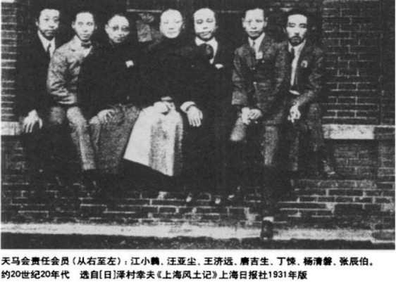 天马’发起人之一丁悚,原来深嗜剧艺,这一回理该一显身手,孰料此人竟患怯场病,多放藉词推诿,不肯登场,同人以此例万不可自破,主角戏不演,零碎角儿,无论如何终要凑一脚的,于是派他饰《玉堂春》里替医生背药箱的童儿,岂知临时他还是不敢上场,在后台大叫救命,结果由张正宇代劳解决。