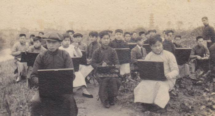 1918年春季上海图画美术学校第一、二年级学生在上海龙华地区“野外写生”,丁悚摄。