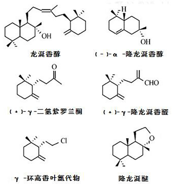 龙涎香香气的主要成分,王文军、陈莎、戴乾圜,《龙涎香的组成及降龙涎醚的合成研究进展》,《有机化学》,2001,167-172,转引自果壳网https://www.guokr.com/article/335533/