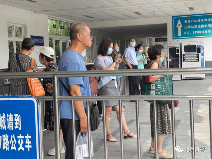 该站的落客区也存在相似问题。从八达岭回城的877路公交车停在公交站北侧,下车地点是一处1米多宽的人行道。不少乘客下车后并未及时散去,有的摘下口罩吸烟,有的则站在一旁伸懒腰,狭小的空间在短时间内聚集了10余名乘客。