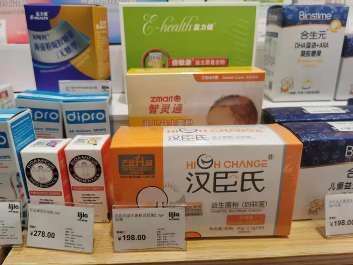 新京报记者对线下线上的益生菌市场进行探访,在北京一家母婴店,合生元、汉臣氏、益力健、智灵通等品牌有相关益生菌粉销售,价格多在198元-298元之间。