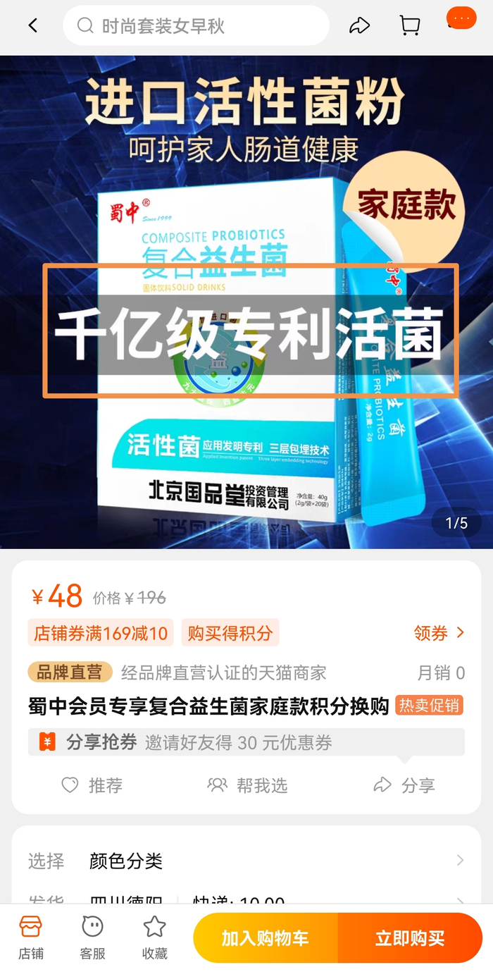 新京报记者从多家电商平台随机购买并查看了亚戈玛、若小姐、亨博士、乐力、仁和、碧生源、搏导狼、蜀中、玉鹤鸣9款益生菌粉产品的相关网店信息。关于活菌添加数量,“千亿级专利活菌”在蜀中旗舰店益生菌产品的宣传页面中十分醒目。该店客服建议,添加量为1.2万亿级别的产品“效果更好”。在天下仁和旗舰店,“≥12000亿进口专利活菌,呵护全家肠胃健康”的字样同样醒目。