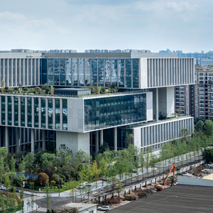 项目占地3.97万平米,建筑面积25万平米,坐落在成都市武侯区电商产业功能区。外观造型融合传统“中国结”的元素,主要由钢结构及大面积的清水混凝土组成。从高空俯瞰大厦,“8”字型的“中国结”镶嵌在茵茵草坪之上,中国文化底蕴与建筑科技美感交相辉映。绿荫环绕的场地绿化和地上部分充分的屋顶绿化,大大提升了周围的城市面貌。