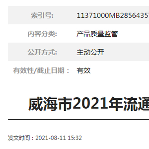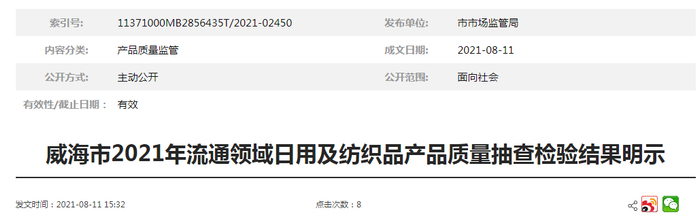 原标题:山东威海市市场监管局公示2021年流通领域日用及纺织品产品质量抽查检验结果