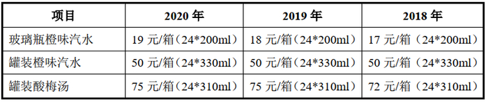 截至2020年末数据,公司的罐装橙味汽水和玻璃瓶橙味汽水分别占主营业务收入的53.42%和27.67%,橙味汽水类合计占比高达81.09%;而所谓公司的第二大类产品酸梅汤类,仅占主营业务收入的10.42%,且玻璃瓶酸梅汤推出时间晚,收入占比仅为3.72%。
