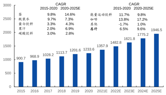 近年来,随着中国人均可支配收入持续增长,城镇化进程不断加速下,中国非酒精类饮料市场规模不断扩大。根据国元证券研究数据统计,中国非酒精饮料市场由2015年9007亿扩张至2020年12336亿,预计2025年市场规模有望增长至19465亿元,CAGR达到9.6%。