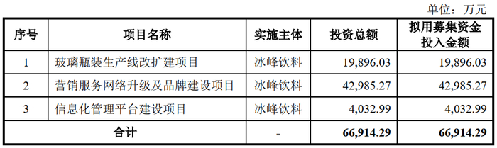 冰峰饮料在成立73年后,近日向深交所递交了招股书,正式踏上了IPO之路。据招股书披露,冰峰饮料拟公开发行不超过6000万股,拟募集资金总额为6.69亿元,其中1.99亿元用于玻璃瓶装生产线改扩建项目,4.3亿元用于营销服务网络升级、品牌建设项目,0.4亿元用于信息化管理平台建设项目。