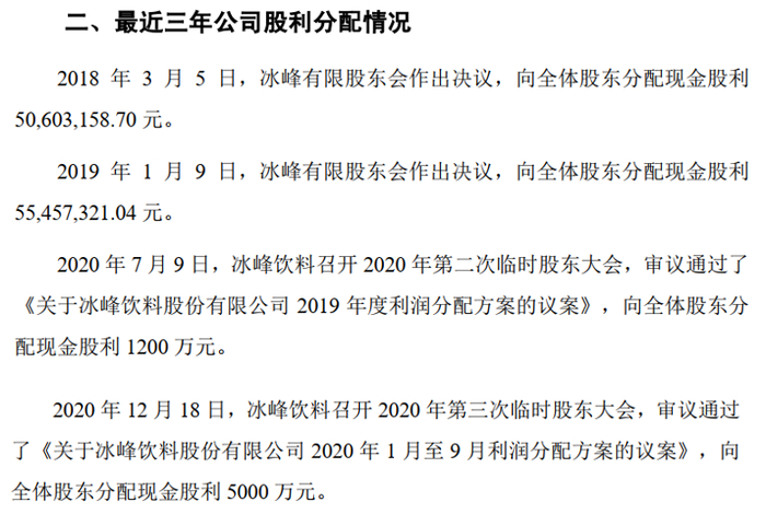 报告期内,冰峰饮料的分红力度较大。2018-2020年,公司分别分配了5060万元、5546万元、6200万元的现金红利,分别占上一年扣非净利润的81.2%和82.6%。并且,冰峰饮料一般是在年初宣布分配上一年的利润,但却在2020年是个例外。