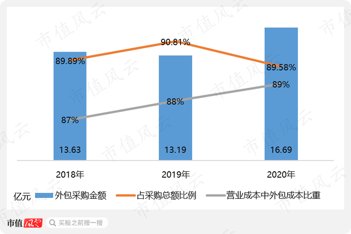 过去三年,久祺股份外包采购金额占对外总采购金额的比重都在90%左右,外包成本在营业成本中的比重也接近90%。