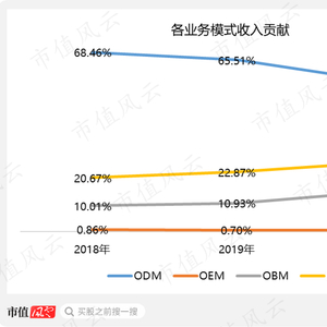2019年至今,虽然0BM模式营收贡献逐年升高,但仍未超过30%,现阶段仍靠给其他品牌客户打工为生。