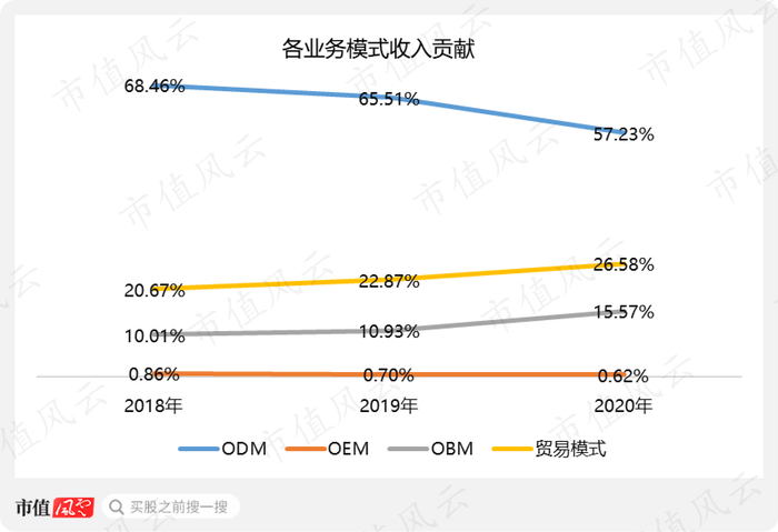 从各经营模式毛利率来看,OBM业务毛利率最高,贸易模式业务次之,ODM最低。又是研发、又是设计、又是生产外包,ODM业务辛苦半天,毛利率还没有贸易业务高,直接改做贸易不香吗?