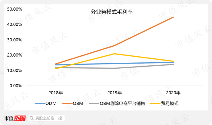 2018年至2020年,OBM毛利率增长亮眼, 由14.25%上升到2020年的44.91%。