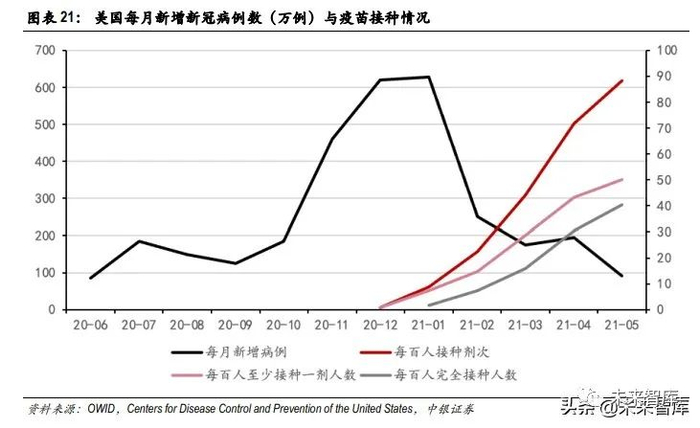 数据直观地反映了疫苗接种率与新增新冠病例数之间相反的关系。虽然新增病例数的下降有许多其 他因素,但是新冠疫苗毫无疑问是新增数量腰斩的一大主要因素,同时非常明显地抑制了美国的第三波疫情。