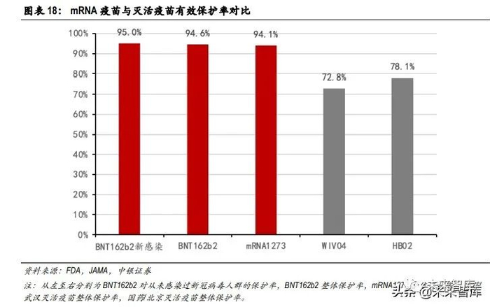 mRNA 疫苗同时具有高保护率和相对更多的不良反应。mRNA 疫苗对新冠病毒的保护率高达 94%以上,国药传统灭活疫苗的保护率虽远远高于 WHO 和 FDA 建议标准的 50%,但不足 80%,与 mRNA 疫苗差距明显。