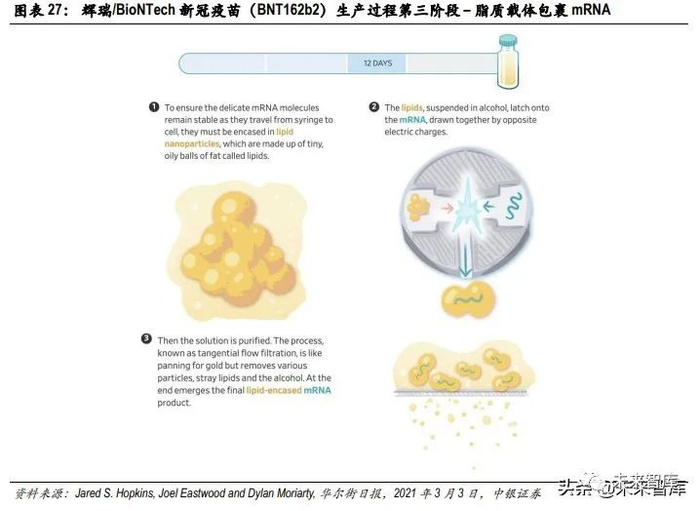 在上述三个生产阶段都完成后,mRNA 疫苗原液已完成,只待灌装分发。随后,经过 2 周的纯净度检测及其他安全性检测,疫苗便能销往世界各地。以上所有生产灌装环节耗时约 64 天。