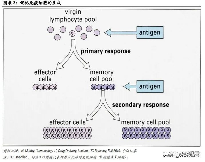 总体而言,获得性免疫的激发来源于对抗原的识别。当某一病原体首次入侵时时,由于没有现成的 特异化 B 细胞和 T 细胞,获得性免疫的应答时间较长。原始 B 细胞和 T 细胞需要时间分化形成特异 性免疫细胞。在完成首次杀灭后,部分特异化的 B 细胞和 T 细胞会留存于体内成为记忆 B 细胞、记 忆 T 细胞。若未来再次遭遇相同抗原入侵,无需原始 B/T 细胞重新分化,记忆 B 细胞和 T 细胞将自我 扩增、激活,迅速启动免疫应答。
