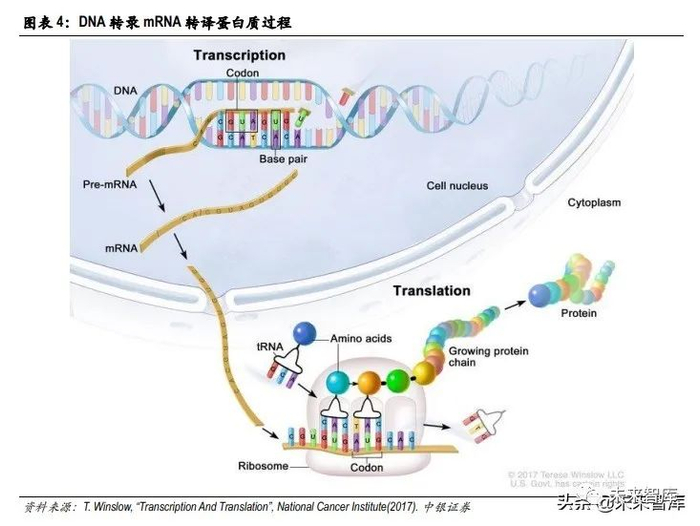 DNA 本身无法直接对人体 产生影响,各类蛋白质才是能够左右表象的物质。mRNA 是 DNA 转化为蛋白质的中间体。mRNA 类似于说明书,能够指导自身细胞生产出特定的蛋白,但是 mRNA 的改变不会被分裂产生的新细胞继承,也不会遗传至下一代个体中。蛋白则是最终生产得到的工具,对生物个体的各项指标直接产生作用。这一条转录转译链被称为生物学“中心法则”。mRNA 疫苗利用了两步表达的机理,使疫苗在不改变 DNA 序列的同时,为人体免疫系统的激活提供更准确的抗原蛋白以及更持久的抗原体内留存时间, 使被激活的特异性免疫更精准,同时免疫效果得到巩固。