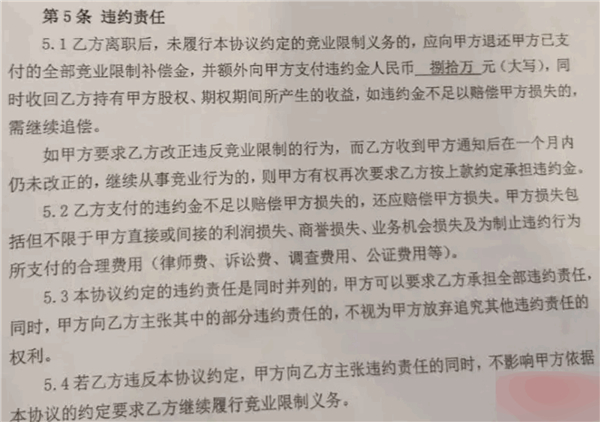 此外,按照合同中的违约责任条款,竞业时限为两年,一旦违反竞业协议,员工不仅要退还长城汽车支付的全部竞业限制补偿金,还要额外支付80万元违约金,同时收回持有长城汽车股权、期权期间产生的收益。
