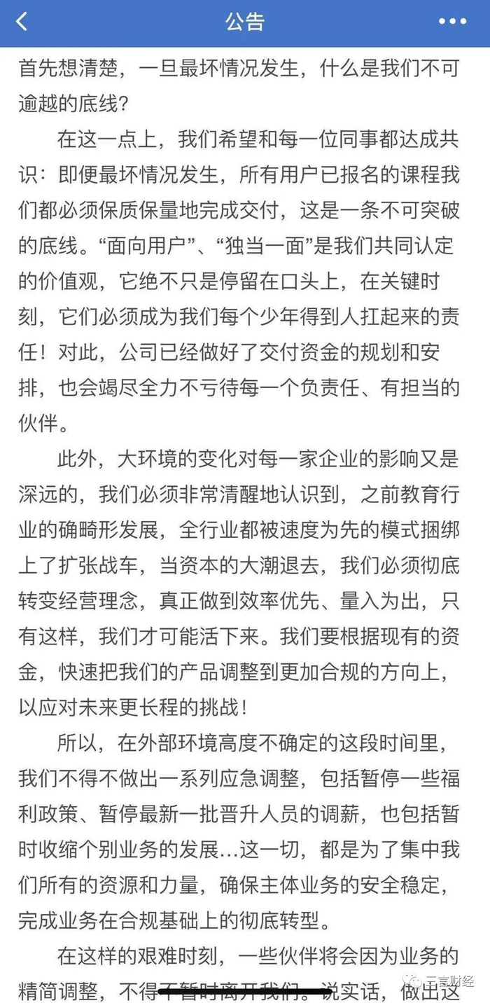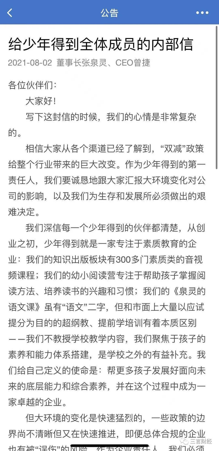 这封信称,由于受到“双减政策”带来的大环境改变,少年得到面临较大困难,不得不做出改变。包括暂停一些福利政策、暂停一批晋升人员调薪,还包括暂时收缩个别业务的发展;同时,信中也提到部分员工将因业务调整离开。