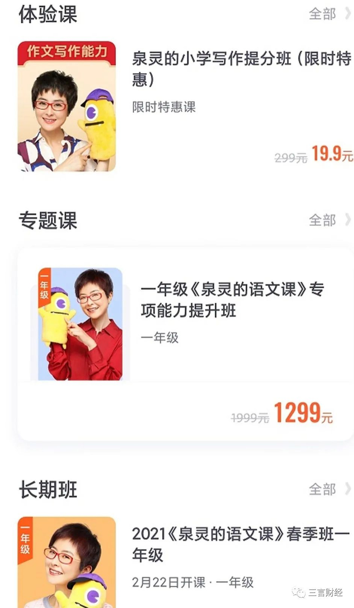 但仍然能在网上找到曾经这门课的相关信息,据了解,《泉灵的语文课》共分5个年级,每年级分为上下两期,即春季班和秋季班;每学期课程售价2599元,一个年级课程价格就要5000多元钱。