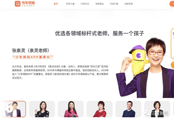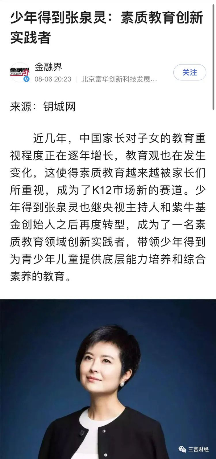 同时,在最近的宣传文章中,少年得到董事长张泉灵也一直在宣传“素质教育”。