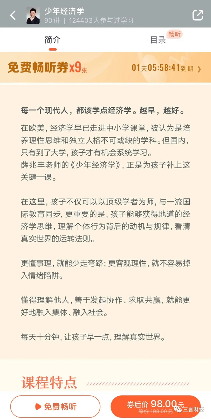 但是,三言财经发现,最近少年得到在推荐一款“少年经济学”课程,由经济学者、原北京大学国家发展研究院教授、美国西北大学法学院博士后研究员以及美国乔治·梅森大学经济学博士薛兆丰主讲。