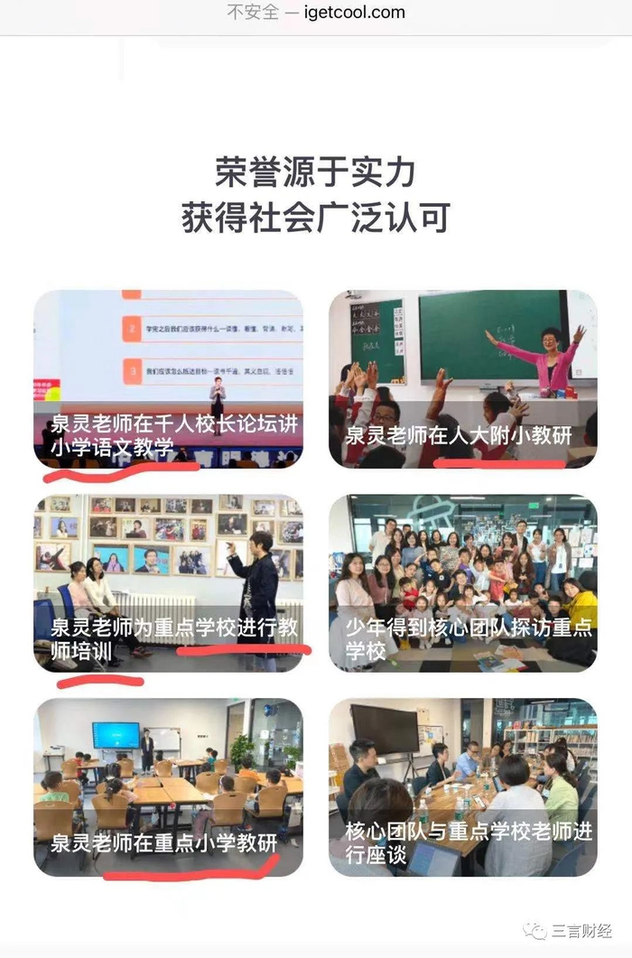少年得到官网宣传中,在介绍公司荣誉的页面,全部是少年得到董事长张泉灵在各大公立学校参与教研以及为重点学校进行教师培训的照片。