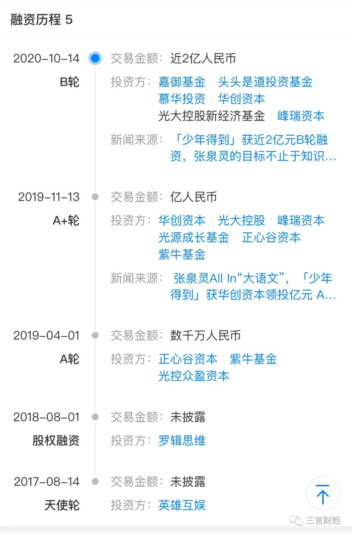据天眼查,少年得到于2017年8月完成天使轮融资,直至2020年10月完成近2亿元人民币B轮融资,短短3年融资总额超过3亿元。