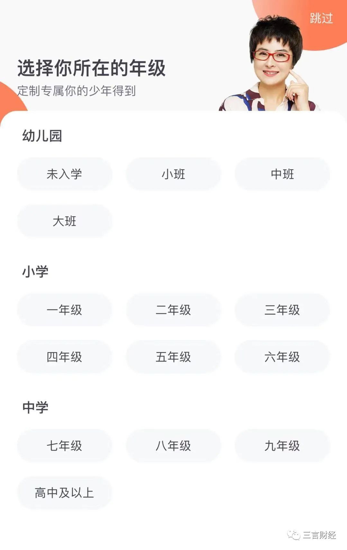 在少年得到App中,与传统K12教育相关的课程内容比比皆是,首次登陆App还会要求用户选择孩子所处年年纪等信息。