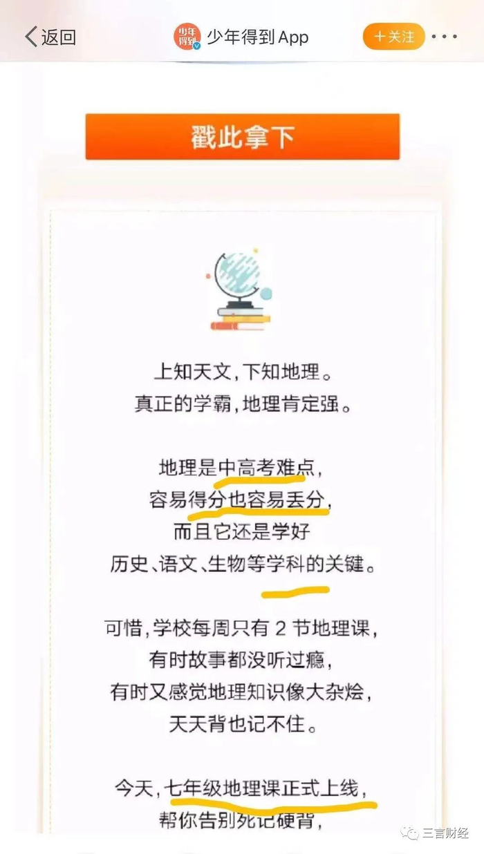 同样是2018年,少年得到官微发布的一则地理课程宣传广告,明确标明了这个课程是为了帮助孩子中考考的更好。