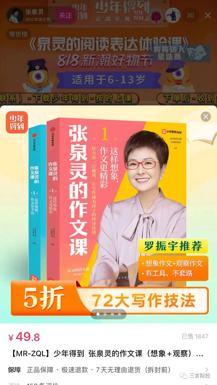 《泉灵的语文课》搜不到后,少年得到又开始直播带货《泉灵的作文课》,宣传“写作能成为孩子的终身优势”。