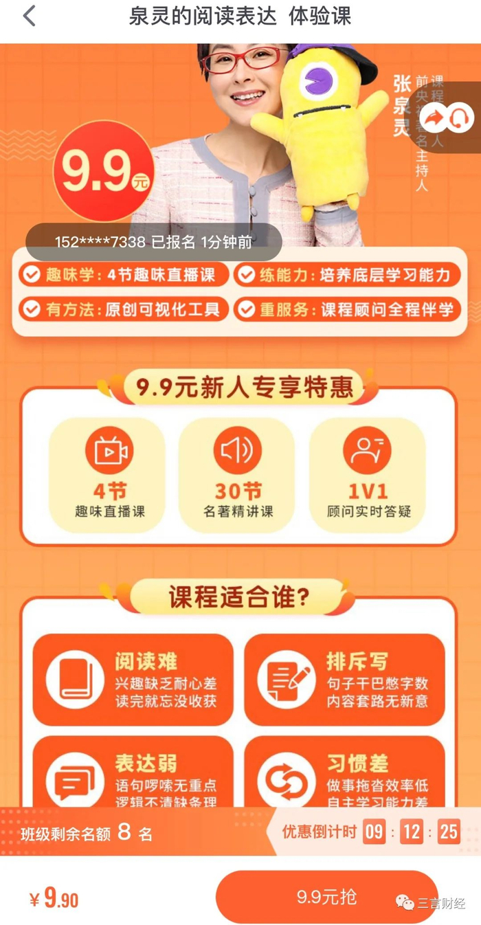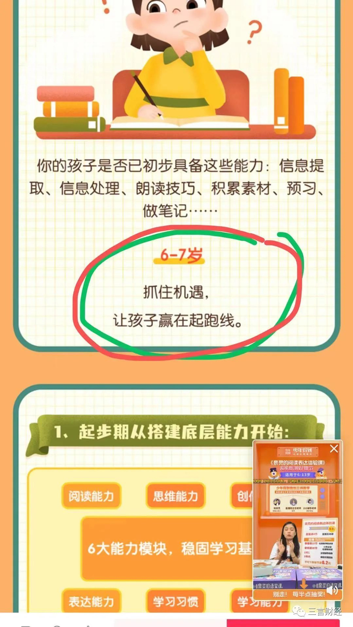课程宣传称,该课适合6-10岁,并且强调针对“阅读难、排斥写、表达弱和习惯差”的孩子制定的优质课程;而且上课后还能提高孩子情商、思辨力、创造力和学习力等能力。