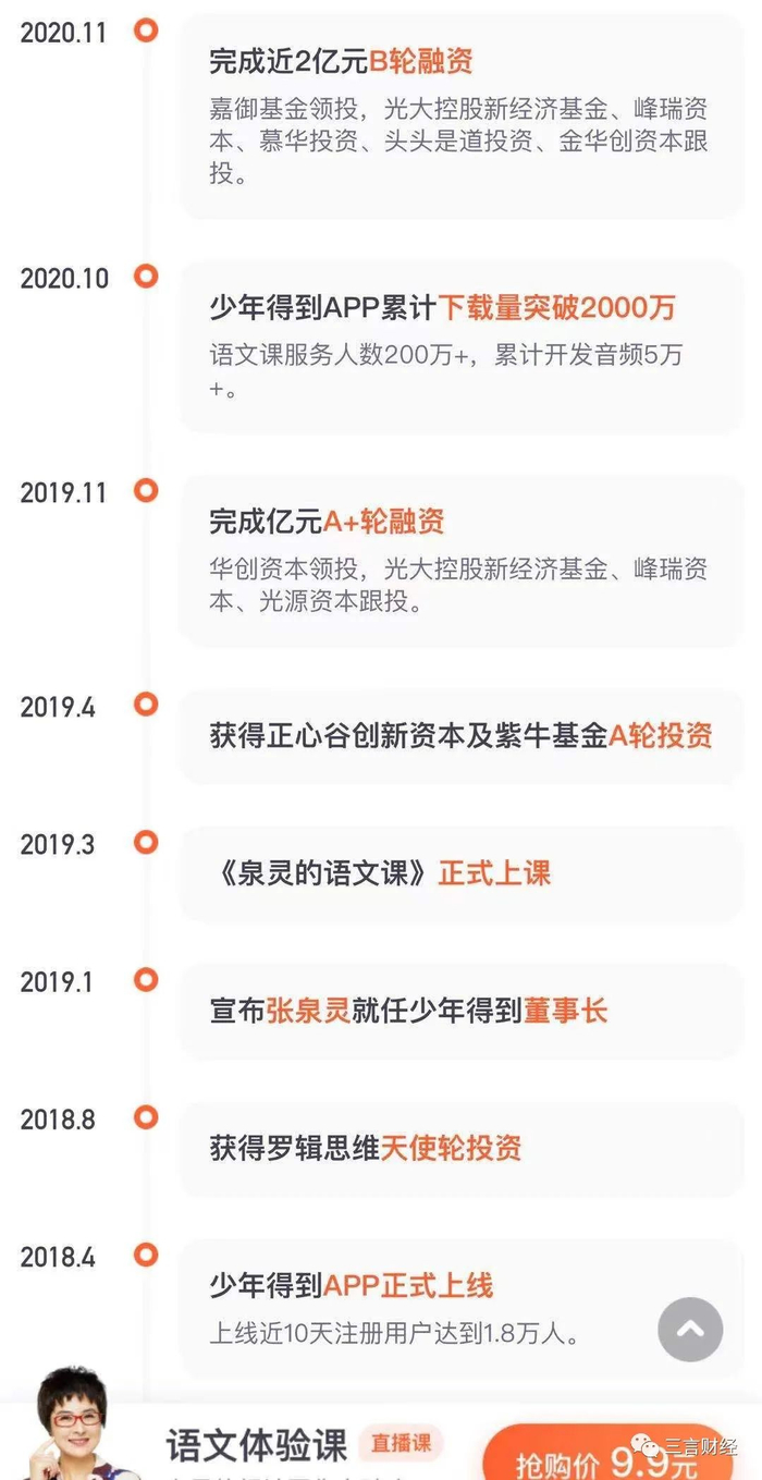 少年得到是罗振宇力推的“专为青少年提供定制化学习服务”的在线教育平台,从其官网展示的公司里程碑时间表中也可以看出,2018年App正式上线,到2020年10月累计下载量突破2000万,足见这个项目的成功。