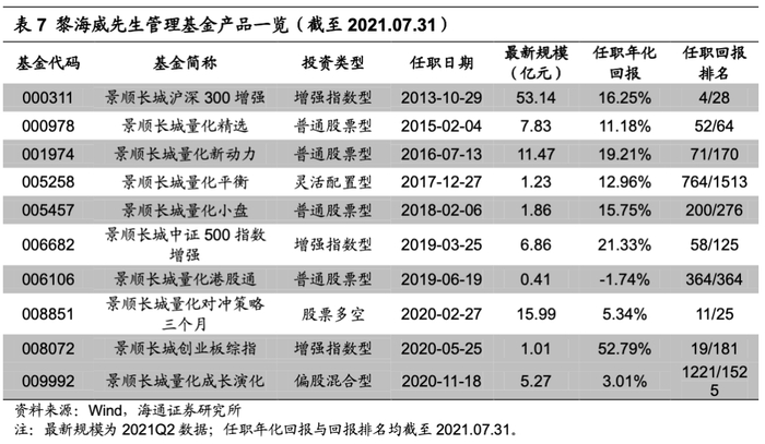 截至2021年7月31日,黎海威先生担任投资经理已达7.78年,历史和当前管理基金产品数量分别为15只和10只,目前在管基金总规模为105.08亿元。黎海威先生具备丰富的量化投研及产品管理经验,历史业绩稳定,在管产品——景顺长城量化新动力、景顺长城沪港深精选等屡获市场殊荣。