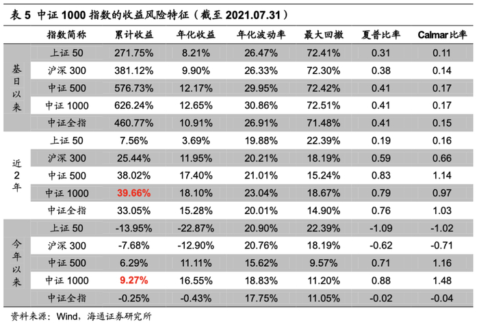 长期来看,指数收益表现优异。自基日(2004.12.31)以来,截至2021.07.31,指数获取累计收益6.26倍,年化收益12.65%,领先沪深300、中证500和中证全指等主流宽基指数,年化超额收益分别达到2.75%、0.48%和1.74%。从风险指标来看,指数年化波动率30.86%,高于其余宽基指数,具备典型的高收益、高波动特征;风险调整后收益较佳,夏普比率0.41,Calmar比率0.17,Sortino比率0.55。