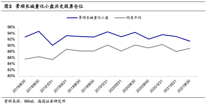 景顺长城量化小盘自成立以来,始终保持高仓位运作。自2018Q2至2021Q2,股票仓位始终保持在90%以上,平均股票仓位高达93.0%,高于同类平均(主动股票开放型基金,下同),且波动较小。我们认为,基金经理较少进行仓位调整,淡化择时,大类资产配置非其核心策略。