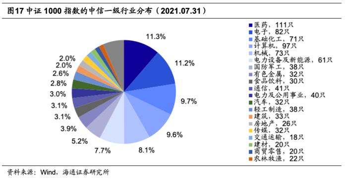 行业分布方面,相较上证50、沪深300等指数以金融地产及消费为主,中证1000指数的行业覆盖范围广泛,分布也更为均衡,主要集中于医药生物、计算机、电子等成长性较强的细分领域以及化工、机械设备、有色金属、建筑装饰等周期行业。