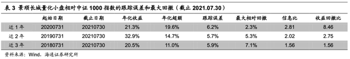 无论是在近1年,还是近2年、近3年的考察窗口下,截止2021年7月底,景顺长城量化小盘相对中证1000指数的跟踪误差和最大回撤均保持在较小范围内,相应的信息比和收益回撤比高。基金年化跟踪误差在6%左右,近1年最大相对回撤仅2.3%,历史最大相对回撤7.1%。