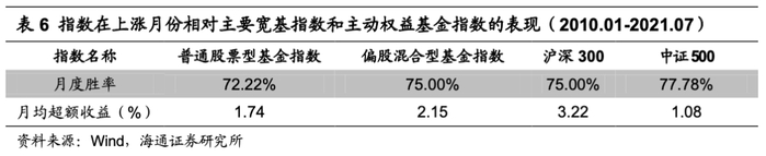 我们统计2010年以来,中证1000指数在上涨月份相对主要宽基指数和主动权益基金指数的胜率及月均超额收益。结果表明,指数涨幅相对沪深300、中证500指数和主动权益基金指数的胜率均超出70%。即,牛市行情中中证1000指数具备较高弹性,能够更好地捕捉市场上涨收益。