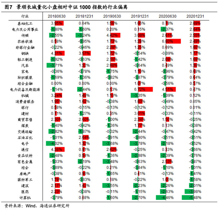 景顺长城量化小盘相对于中证1000指数的行业偏离小,自2018H1以来,绝大部分行业的偏离都不超过5%。2020H2,产品在基础化工、电力及公用事业、传媒、农林牧渔上的超配幅度较大,超配比例大于2%;在建筑、医药和计算机上的低配幅度较大,低配比例大于2%。