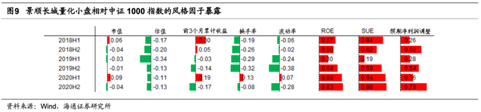 从因子暴露来看,自2018H1以来,景顺长城量化小盘相对中证1000指数的市值暴露低,始终保持在0附近。在一些Alpha因子,如ROE、SUE、预期净利润调整上的暴露则较高。我们认为,基金未明显约束组合相对指数在这些因子上的暴露程度。